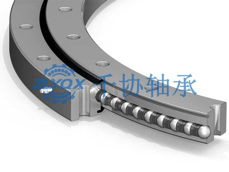 单排四点接触球式回转支承由两个座圈组成,结构紧凑、重量轻、钢球与圆弧滚道四点接触,能同时承受轴向力、径向力和倾翻力矩。回转式输送机、焊接操作机、中小型起重机和挖掘机等工程机械均可选用。...