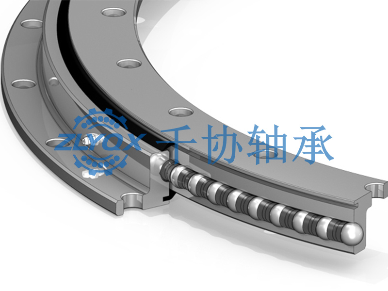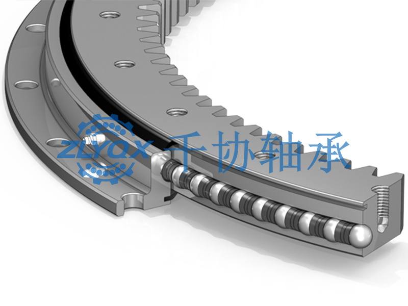 单排四点接触球式回转支承(轻型L系列),由两个座圈组成,结构紧凑,重量轻,钢球与圆弧滚道四点接触,能同时承受轴向力、径向力和倾翻力矩。回转式输送机、焊接操作机、自动清洗机等中小型和轻型机械均可选用。...